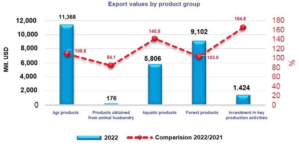 According to a report of the Ministry of Agriculture and Rural Development, the export turnover of agricultural, forestry, and aquatic products in June 2022 was estimated to reach 5.18 billion USD, contributing to the total export value of 27.88 billion USD in the first half of 2022, increasing by 13.9% compared with the same period in 2021. Of which, the export value of main agricultural products is estimated at 11.37 billion USD, increasing by 8.8%, the export value of aquatic products is estimated at 5.8 billion USD, increasing by 40.8%, and the export value of forest products is estimated at 9.1 billion USD, increasing by 3%, the export value of production inputs is estimated at 1.42 billion USD, increasing by 64.8%, salt export value is estimated at 2.7 million USD, increasing by 78.8%.