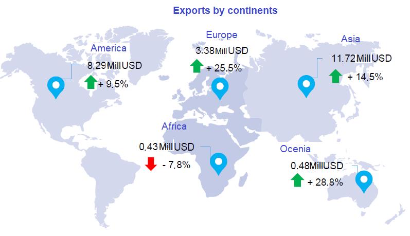 The total export values of agricultural, forest and aquatic products in the first half of 2022 of Viet Nam to the Asian, American, European, Oceanian markets are estimated to reach 11.72 billion USD (increased by 14.5%), 8.29 billion USD (increased by 9.5%), 3.38 billion USD (increased by 25.5%) and 477 million USD (increased by 28.8%) respectively. Particularly, the value of those products exported to the African market is estimated to reach 426 million USD, decreased by 7.8%. The market shares of Asia, America, Europe, Oceania, and Africa in the total export value of the agricultural, forest, and aquatic products of Viet Nam in the half of 2022 are 42%; 29.7%; 12.1%; 1.7%, and 1.5% respectively.