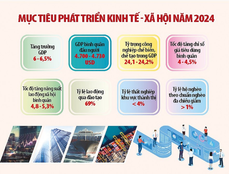 Theo Nghị quyết về Kế hoạch phát triển kinh tế - xã hội năm 2024 đã được thông qua, mục tiêu tăng trưởng GDP của năm 2024 được xác định là từ 6 - 6,5%, một mục tiêu đòi hỏi sự nỗ lực, quyết tâm cao.