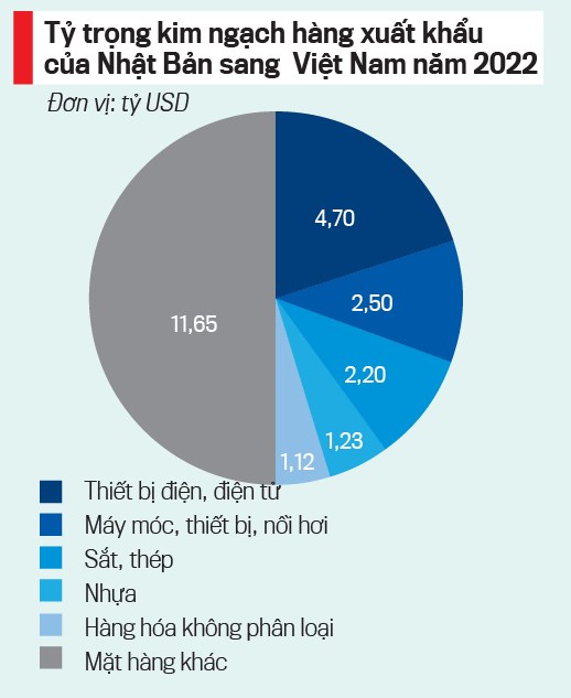 Trong khi đó, Việt Nam nhập khẩu từ Nhật Bản những mặt hàng phục vụ cho sản xuất công nghiệp gồm: máy móc, thiết bị, dụng cụ và phụ tùng, sản phẩm điện tử và linh kiện, sắt thép các loại, vải các loại, linh kiện ô tô, chất dẻo nguyên liệu, hóa chất, nguyên phụ liệu dệt, may, da…
