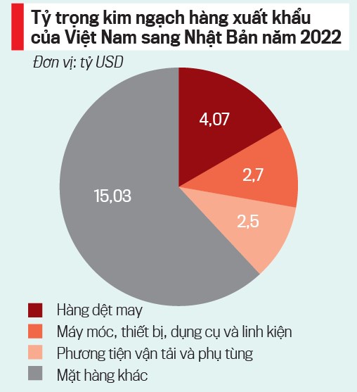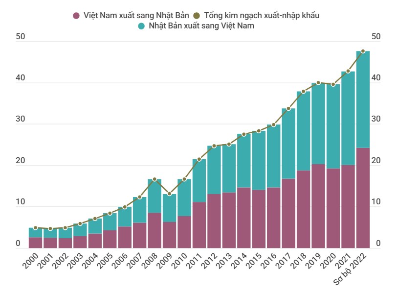 Tổng kim ngạch xuất nhập khẩu hai nước năm 2022 đạt gần 50 tỷ USD, đưa Nhật Bản trở thành đối tác thương mại lớn thứ 4 của Việt Nam; trong đó Việt Nam xuất khẩu sang Nhật Bản đạt gần 25 tỷ USD, nhập khẩu đạt gần 24 tỷ USD.