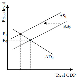 Chi phí sản xuất tăng lên khiến giá cả hàng hoá và dịch vụ tăng từ P0 lên P1, dẫn đến cung hàng hoá giảm từ AS0 đến AS1. Chi phí sản xuất có thể tăng lên do một số nguyên nhân như: