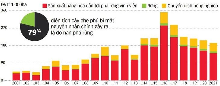 Hình 1: Diện tích cây bao phú bị mất hàng năm tại Việt Nam từ 2001-2021
