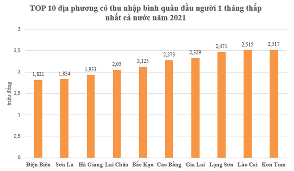 Kết quả khảo sát mức sống dân cư năm 2021 của Tổng cục Thống kê, thu nhập bình quân 1 người 1 tháng năm 2021 theo giá hiện hành đạt 4,205 triệu đồng, giảm 1,1% so với năm 2020. Thu nhập bình quân 1 người 1 tháng năm 2021 ở khu vực thành thị đạt 5,388 triệu đồng, cao gấp gần 1,5 lần khu vực nông thôn (3,486 triệu đồng). So với năm 2020, thu nhập bình quân 1 người 1 tháng năm 2021 ở khu vực nông thôn không thay đổi đáng kể. Xét theo từng địa phương, Điện Biên là tỉnh có thu nhập bình quân đầu người thấp nhất cả nước với 1,821 triệu đồng/người/tháng. Xếp trên Điện Biên lần lượt là Sơn La (1,834 triệu đồng/người/tháng), Hà Giang (1,933 triệu đồng/người/tháng), Lai Châu (2,05 triệu đồng/người/tháng), Bắc Kạn (2,125 triệu đồng/người/tháng). Ngoài ra, trong top 10 còn có Cao Bằng (2,273 triệu đồng/người/tháng), Gia Lai (2,329 triệu đồng/người/tháng), Lạng Sơn (2,471 triệu đồng/người/tháng), Lào Cai (2,515 triệu đồng/người/tháng) và Kon Tum (2,517 triệu đồng/người/tháng).