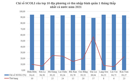 Có thể thấy, các tỉnh Lào Cai, Lạng Sơn, Sơn La và Điện Biên có chỉ số SCOLI khá cao nằm trong top 10 các tỉnh, thành "đắt đỏ" nhất cả nước. Ngoài ra, các tỉnh khác trong top 10 thu nhập bình quân thấp nhất có thứ hạng SCOLI như sau: Bắc Kạn (15), Cao Bằng (20), Kon Tum (23), Lai Châu (24) và Hà Giang (25). Duy nhất Gia Lai có chỉ số SCOLI thấp, nằm ở vị trí 57.