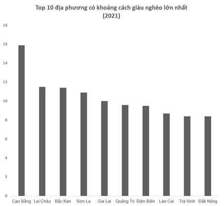 10 địa phương có khoảng cách giàu nghèo lớn nhất là Cao Bằng, Lai Châu, Bắc Kạn, Sơn La, Gia Lai, Quảng Trị, Điện Biên, Lào Cai, Trà Vinh, Đắk Nông.