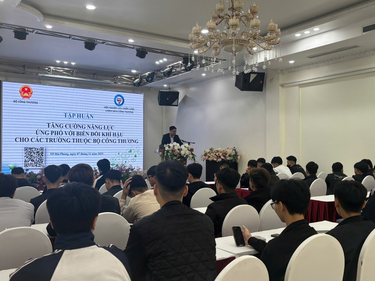 Sáng ngày 7/11/2025, tại TP. Hải Phòng, Cục Đổi mới sáng tạo, Chuyển đổi xanh và Khuyến công (Bộ Công Thương) đã phối hợp với Viện Nghiên cứu Chiến lược, Chính sách Công Thương tổ chức lễ khai giảng khóa tập huấn “Tăng cường năng lực ứng phó với biến đổi khí hậu cho Trường thuộc Bộ Công Thương”. Khóa học thu hút hơn 40 học viên là giảng viên, sinh viên các trường trực thuộc Bộ, nhằm trang bị kiến thức và kỹ năng thích ứng, giảm nhẹ rủi ro trong bối cảnh khí hậu toàn cầu đang thay đổi phức tạp.