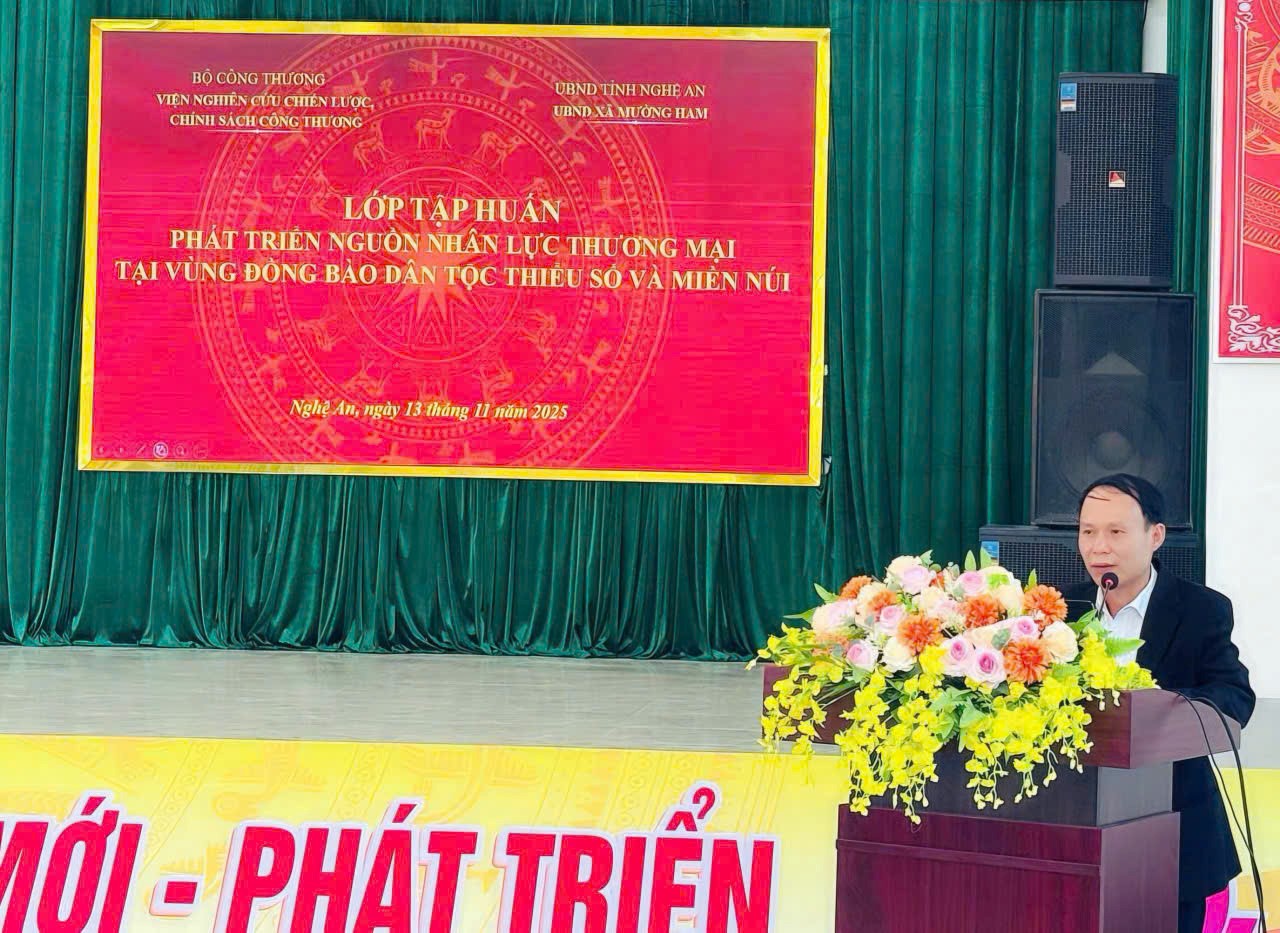 Ngày 13/11/2025, tại xã Mường Ham (tỉnh Nghệ An), Viện Nghiên cứu Chiến lược, Chính sách Công Thương tổ chức khai giảng lớp “Tập huấn phát triển nguồn nhân lực thương mại tại vùng đồng bào dân tộc thiểu số và miền núi”. Hoạt động nhằm tăng cường năng lực cho đội ngũ cán bộ cơ sở, góp phần thúc đẩy phát triển thương mại bền vững tại các khu vực còn nhiều khó khăn của tỉnh.