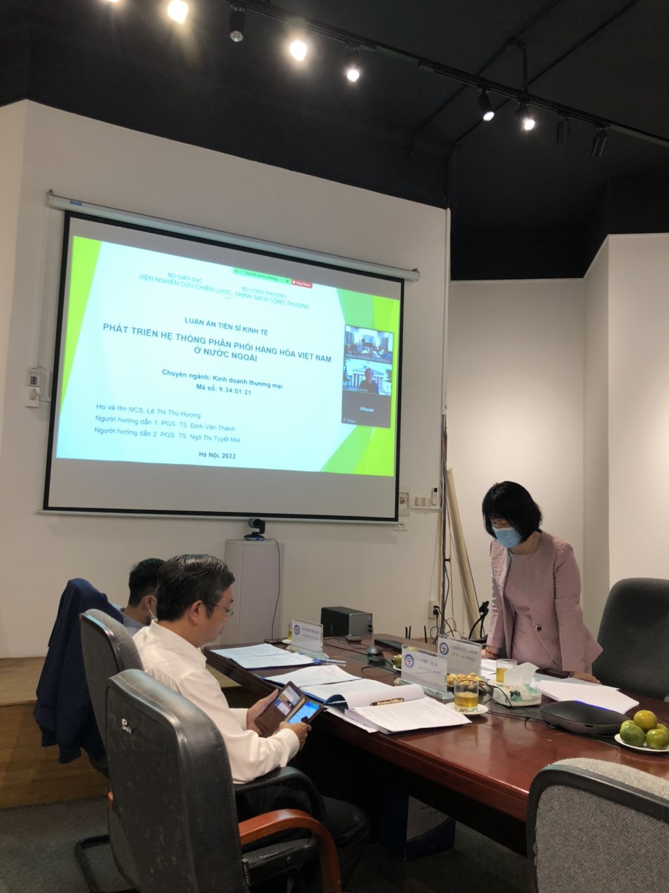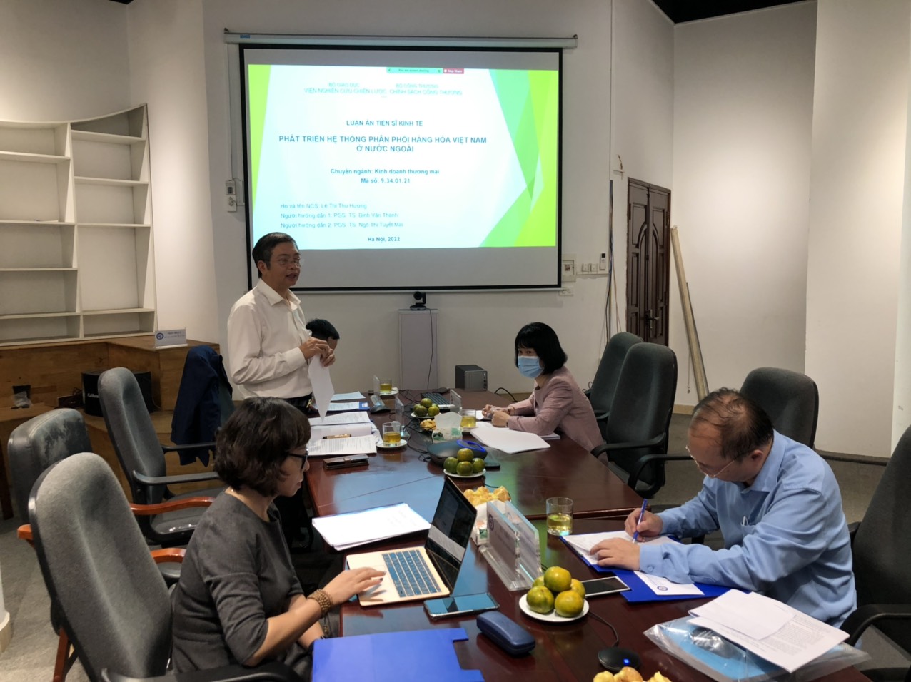 Vào hồi 15h30’ ngày 31/03/2022, Viện Nghiên cứu Chiến lược, Chính sách Công Thương - Bộ Công Thương đã tổ chức buổi Bảo vệ Luận án Tiến sĩ cấp Cơ sở cho NCS. Lê Thị Thu Hương, với đề tài: “Phát triển hệ thống phân phối hàng hóa Việt Nam ở nước ngoài” Chuyên ngành: Kinh doanh Thương mại, mã số 9.34.01.21, theo quyết định thành lập Hội đồng đánh giá Luận án Tiến sĩ cấp Cơ sở số 47/QĐ-CLCT ngày 14 tháng 02 năm 2022 của Viện trưởng Viện Nghiên cứu Chiến lược, Chính sách Công Thương.