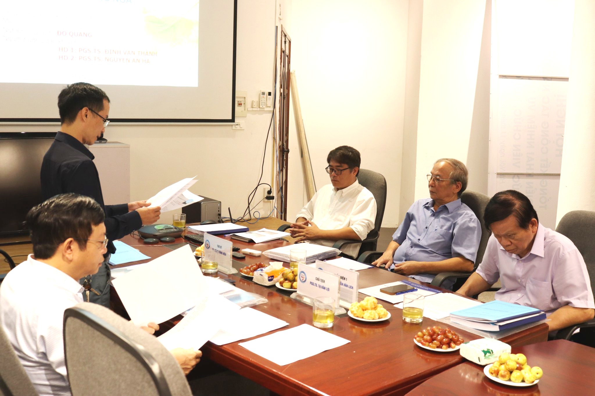 Các thành viên Hội đồng đánh giá luận án tiến sĩ cấp cơ sở gồm có: PGS.TS. Tạ Văn Lợi, Trường Đại học Kinh tế Quốc dân - Chủ tịch hội đồng; PGS.TS. Nguyễn Văn Lịch, Viện Nghiên cứu Chiến lược, Chính sách Công Thương - Phản biện 1; PGS.TS. Doãn Kế Bôn, Trường Đại học Thương mại - Phản biện 2; PGS.TS. Lê Trịnh Minh Châu, Viện Nghiên cứu Chiến lược, Chính sách Công Thương - Ủy viên; PGS.TS. Trịnh Thị Thu Hương, Trường đại học Ngoại thương - Ủy viên; TS. Trịnh Thị Thanh Thủy, Viện Nghiên cứu Chiến lược, Chính sách Công Thương - Ủy viên và TS. Đặng Công Hiến, Viện Nghiên cứu Chiến lược, Chính sách Công Thương - Ủy viên, Thư ký hội đồng. Buổi đánh giá còn có sự tham dự của các giáo viên, các nhà khoa học và các nghiên cứu sinh của Viện.