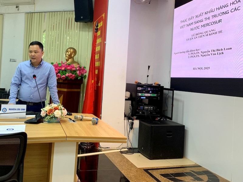 Dưới sự chủ trì của Chủ tịch Hội đồng, NCS. Lê Hồng Quang đã trình bày tóm tắt nội dung luận án, trong đó làm rõ mục tiêu, đối tượng, phạm vi và kết quả nghiên cứu. Luận án đã hệ thống hóa cơ sở lý luận, tổng kết kinh nghiệm quốc tế về xuất khẩu hàng hóa sang MERCOSUR; phân tích thực trạng xuất khẩu của Việt Nam sang thị trường này với dữ liệu cập nhật, đồng thời đề xuất các giải pháp nhằm thúc đẩy xuất khẩu hàng hóa của Việt Nam sang MERCOSUR trong giai đoạn tới.