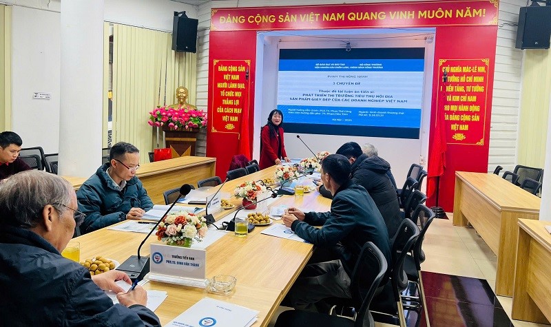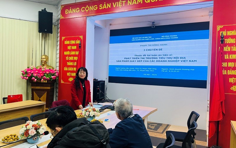NCS. Phạm Thị Hồng Hạnh đã trình bày tóm tắt nội dung của 03 chuyên đề tiến sỹ, bao gồm: Chuyên đề 1: “Một số vấn đề lý luận và kinh nghiệm thực tiễn phát triển thị trường tiêu thụ sản phẩm giày dép của doanh nghiệp". Chuyên đề 2: "Phát triển thị trường tiêu thụ giày dép Việt Nam giai đoạn 2016-2023". Chuyên đề 3: “Nghiên cứu, xây dựng các quan điểm, định hướng và giải pháp phát triển thị trường tiêu thụ nội địa sản phẩm giày dép của các doanh nghiệp Việt Nam đến năm 2035".