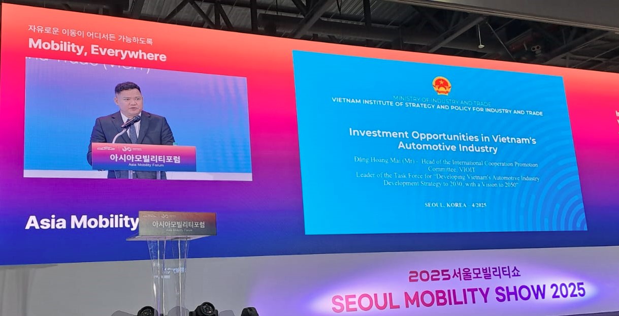 Trong thời gian từ ngày 06/4/2025 đến 13/4/2025, Viện Nghiên cứu Kinh tế công nghiệp và Thương mại Hàn Quốc (KIET) - cơ quan thuộc Chính phủ Hàn Quốc và Hiệp hội các nhà sản xuất ô tô Hàn Quốc (KAMA) đã phối hợp tổ chức Diễn đàn ASIA Mobility và SEOUL MOBILITY SHOW 2025 tại thành phố Seoul, Hàn Quốc.