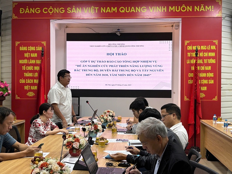 Sáng ngày 07 tháng 11 năm 2025, tại Hội trường tầng 1, trụ sở 17 Yết Kiêu - Hà Nội, Viện Nghiên cứu Chiến lược, Chính sách Công Thương đã tổ chức thành công Hội thảo góp ý Dự thảo báo cáo tổng hợp nhiệm vụ: “Đề án Nghiên cứu phát triển năng lượng vùng Bắc Trung Bộ, duyên hải Trung Bộ và Tây Nguyên đến năm 2030, tầm nhìn đến 2045” do ThS. Nguyễn Ngọc Quang - Phó trưởng Phòng Thông tin và Truyền Thông làm chủ nhiệm.