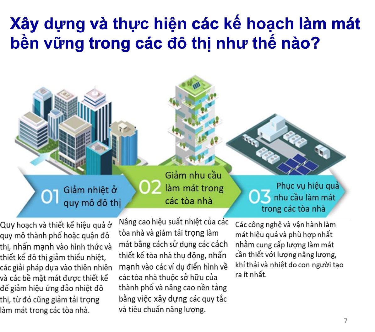 TS Trịnh Quốc Dũng, Khoa Năng lượng Nhiệt, Trường Cơ khí Đại học Bách Khoa Hà Nội trình bày bài tham luận “ Giảm nhẹ phát thải trong hoạt động làm mát các đô thị tại Việt Nam”.  Ông Dũng cho biết các thách thức đối với đô thị hiện nay: Hiện tượng nhiệt độ không khí và bề mặt ở các khu vực thành thị cao hơn so với các vùng xung quanh. Bên cạnh đó, các tòa nhà cao tầng gần nhau phản chiếu và hấp thụ ánh sáng mặt trời, sự tích tụ ô nhiễm và thiếu trao đổi nhiệt đối lưu với nhau dẫn tới tăng nhiệt độ so với những khu vực khác; Nắng nóng cực đoan kèm theo sóng nhiệt: Hiện tượng đô thị hoá nhanh kéo theo diện tích cây xanh giảm, bề mặt bê tông tăng. Để giải quyết vấn đề này ông Dũng đưa ra giải pháp làm mát đô thị (Urban cooling) nhằm giúp các thành phố thích ứng với các hiện tượng nắng nóng cực đoan ngày càng tăng do biến đổi khí hậu bao gồm: