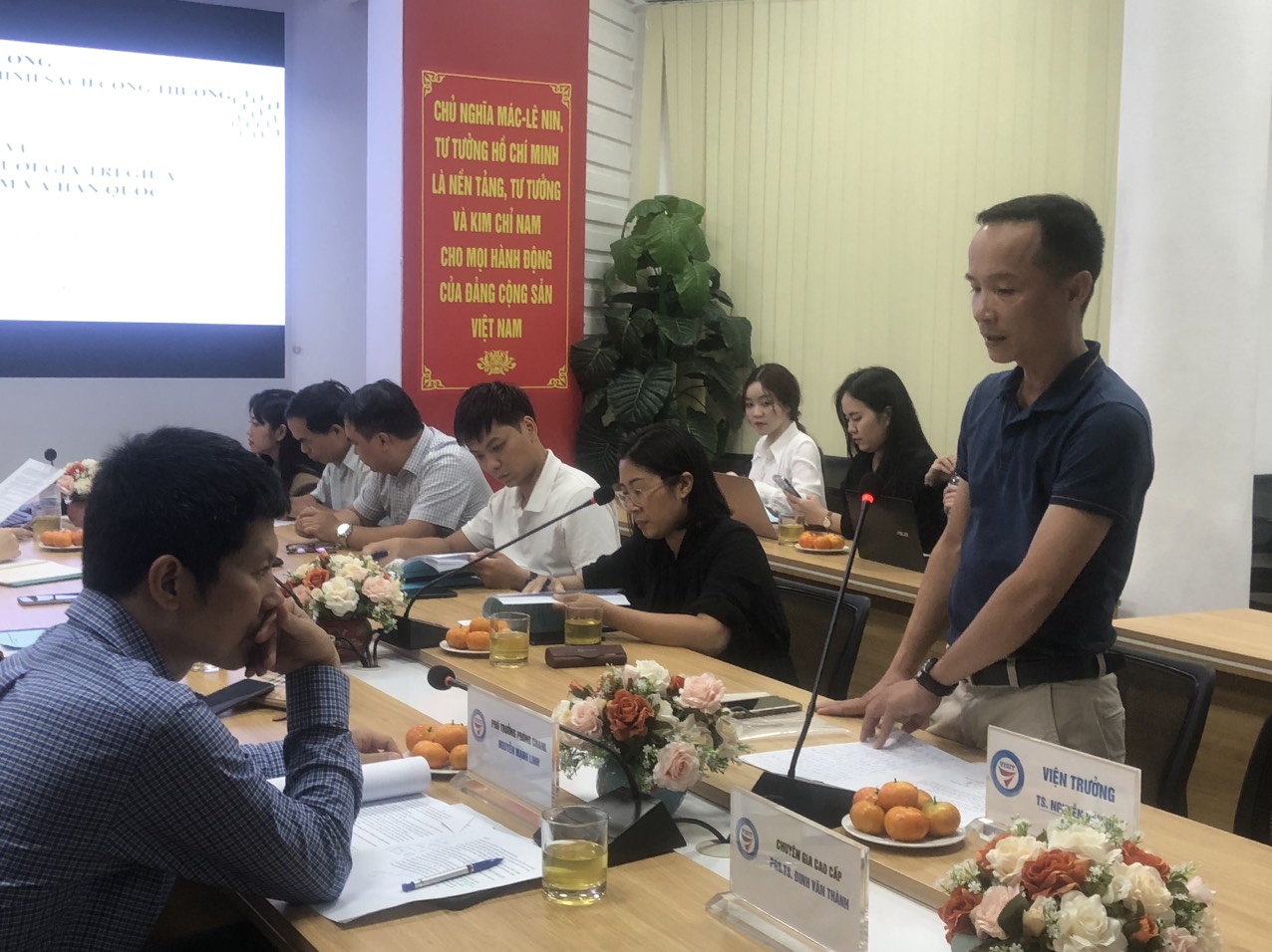 Thay mặt nhóm nghiên cứu, Th.S Nguyễn Minh Thắng - thay mặt nhóm thực hiện nhiệm vụ đã trình bày tóm tắt nội dung của bản báo cáo. Nội dung của báo cáo gồm 2 phần: Phần 1: Tổng quan tăng cường kết nối chuỗi giá trị giữa doanh nghiệp Việt Nam và Hàn Quốc. Trong phần này nhóm nghiên cứu đưa ra một số vấn đề lý luận về kết nối chuỗi giá trị giữa các doanh nghiệp nội địa và các công ty xuyên quốc gia; Thực trạng kết nối chuỗi giá trị giữa doanh nghiệp Việt Nam và Hàn Quốc; Thực trạng chính sách tăng cường kết nối chuỗi giá trị giữa doanh nghiệp Việt Nam và Hàn Quốc. Phần 2: Giải pháp tăng cường kết nối chuỗi giá trị giữa doanh nghiệp Việt Nam và Hàn Quốc. Trong phần này, nhóm nghiên cứu đưa ra Bối cảnh trong nước và quốc tế tác động đến việc tăng cường kết nối chuỗi giá trị giữa doanh nghiệp Việt Nam và Hàn Quốc; Quan điểm, định hướng tăng cường kết nối chuỗi giá trị giữa doanh nghiệp Việt Nam và Hàn Quốc; Đề xuất giải pháp tăng cường kết nối chuỗi giá trị giữa doanh nghiệp Việt Nam và Hàn Quốc.