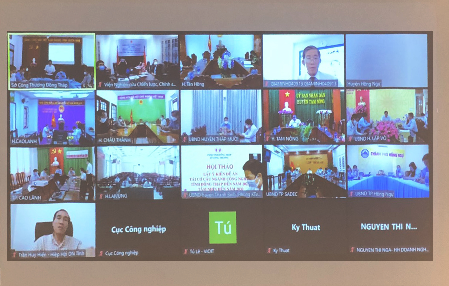 Hội thảo do Ông Nguyễn Văn Na - Phó Giám đốc Sở Công Thương Tỉnh Đồng Tháp - Chủ trì buổi họp tại điểm cầu Sở Công Thương Đồng Tháp và Ông Nguyễn Văn Hội - Viện trưởng Viện nghiên cứu Chiến lươc, Chính sách Công Thương - đồng chủ trì buổi họp tại điểm cầu Hà Nội. Tham dự hội thảo còn có đại diện lãnh đạo các Sở, Ban, Ngành cấp Tỉnh; đại diện lãnh đạo Ủy ban nhân dân, Phòng Kinh tế hạ tầng, đại diện các hiệp hội doanh nghiệp của Tỉnh tại các điểm cầu khác.
