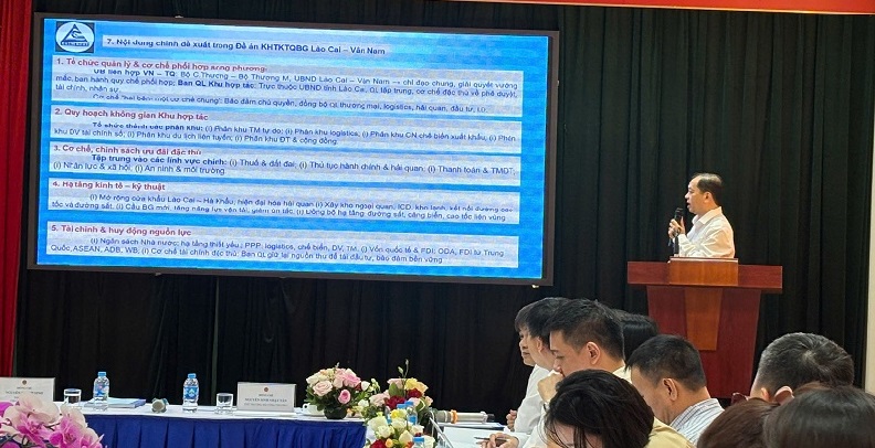 Thay mặt nhóm nghiên cứu, TS. Hoàng Trương đã trình bày báo cáo Đề án: “Thí điểm xây dựng mô hình mới về khu hợp tác kinh tế qua Biên giới tại cửa khẩu quốc tế đường bộ Lào Cai”. Đề án đề xuất mô hình “Hai quốc gia, hai khu công nghiệp” hay “Hai nước - Hai khu vực - Một cơ chế phối hợp” với các lĩnh vực hợp tác trọng tâm bao gồm: kết nối hạ tầng, phối hợp chuỗi công nghiệp, hài hòa chính sách, xây dựng cửa khẩu thông minh.