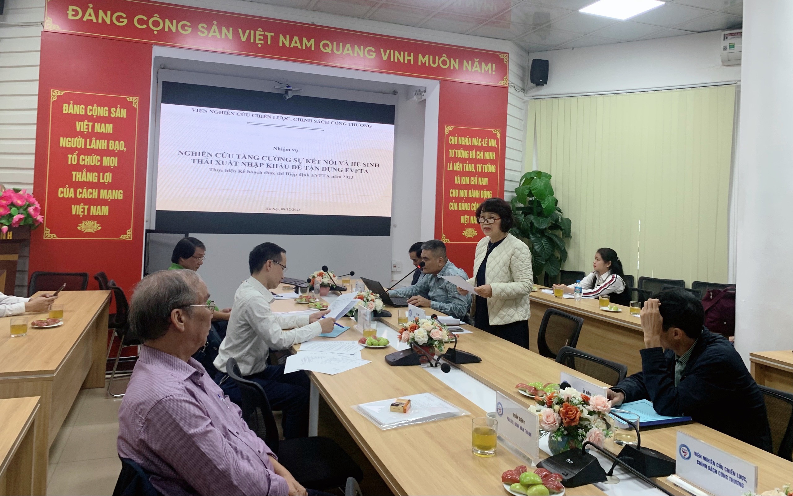 Chiều ngày 08/12/2023 tại trụ sở Viện Nghiên cứu chiến lược, chính sách Công Thương, số 17 Yết Kiêu, Hà Nội đã diễn ra buổi Họp nghiệm thu nhiệm vụ “Nghiên cứu tăng cường sự kết nối và hệ sinh thái xuất nhập khẩu để tận dụng EVFTA” do Ths. Ngô Thị Thanh Hương - Trung tâm tham vấn WTO và FTAs làm chủ nhiệm.