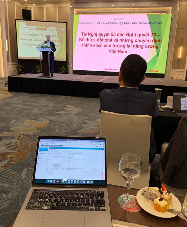Tại hội thảo, ông Nguyễn Mạnh Sơn - Vụ Tài chính - Kinh tế ngành (Bộ Tài chính) trình bày về chính sách kinh tế vĩ mô và tài chính phục vụ quá trình chuyển dịch năng lượng, nhấn mạnh nền kinh tế Việt Nam đang tái cơ cấu mạnh mẽ theo hướng tăng trưởng xanh và bền vững. Ngành công nghiệp năng lượng tăng trưởng ổn định, tỷ trọng năng lượng tái tạo (điện gió, điện mặt trời, sinh khối) tăng từ 4,9% năm 2020 lên 15% năm 2025, thể hiện quyết tâm của Chính phủ trong chuyển dịch sang nguồn năng lượng xanh. Ông cho rằng, để bảo đảm tiến độ và hiệu quả chuyển đổi, Việt Nam cần ưu tiên cơ chế tài chính linh hoạt, lồng ghép mục tiêu phát thải thấp vào chính sách tài khóa và đầu tư, đa dạng hóa nguồn vốn xanh, đồng thời chú trọng phát triển nguồn nhân lực chất lượng cao phục vụ nền kinh tế các-bon thấp.