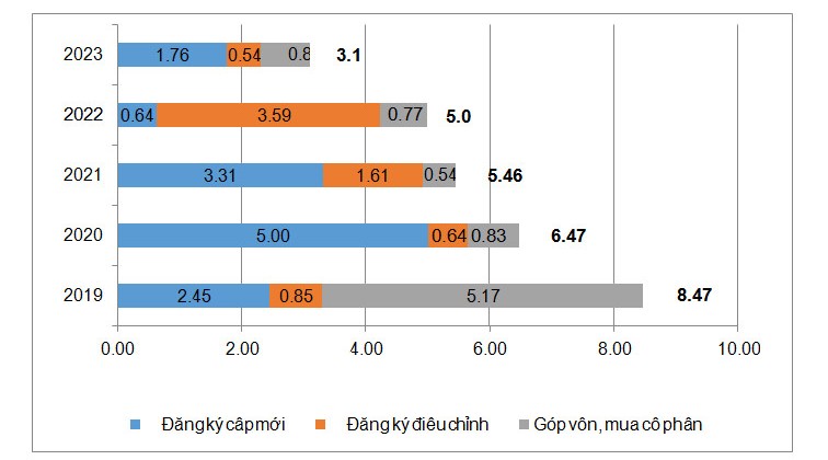 Tổng vốn đầu tư nước ngoài đăng ký vào Việt Nam tính đến ngày 20/02/2023 bao gồm: Vốn đăng ký cấp mới, vốn đăng ký điều chỉnh và giá trị góp vốn, mua cổ phần của nhà đầu tư nước ngoài đạt 3,1 tỷ USD, giảm 38% so với cùng kỳ năm trước.