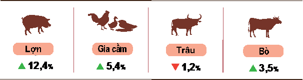 - Chăn nuôi: Chăn nuôi gia súc, gia cầm trong tháng phát triển ổn định, dịch bệnh cơ bản được kiểm soát. Ước tính tổng số lợn của cả nước tính đến thời điểm cuối tháng 11/2022 tăng 12,4% so với cùng thời điểm năm 2021; tổng số bò tăng 3,5%; tổng số trâu giảm 1,2%; tổng số gia cầm tăng 5,4%.