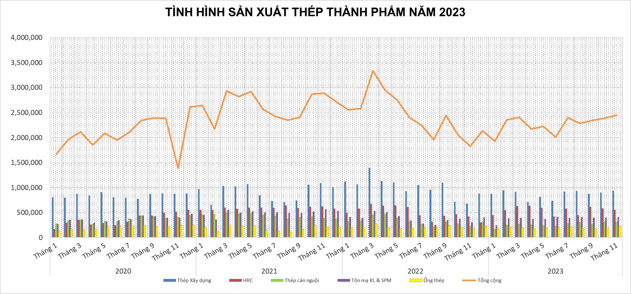 Sản xuất thép thành phẩm đạt 2,452 triệu tấn, tăng 2,8% so với tháng 10/2023 và tăng 34,3% so với cùng kỳ 2022;