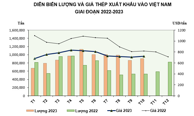 Tháng 10/2023, Việt Nam đã nhập khẩu khoảng 1,279 triệu tấn thép giảm 8,94% so với tháng 9/2023 và tăng 53,96% so với cùng kỳ năm trước về lượng nhập khẩu. Giá trị nhập khẩu đạt hơn 957 triệu USD giảm 3,94% so với tháng trước và tăng 30,96% so với cùng kỳ năm 2022.