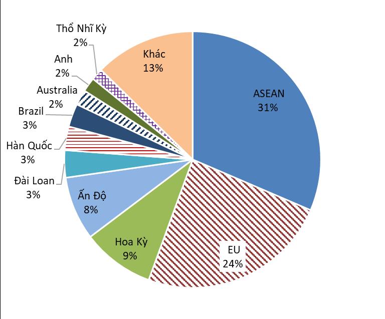Thị trường xuất khẩu chủ yếu của Việt Nam trong 10 tháng đầu năm 2023 là: khu vực ASEAN (31,46%), Khu vực EU (24,12%), Hoa Kỳ (9,13%), Ấn Độ (8,03%) và Đài Loan (3,44%).