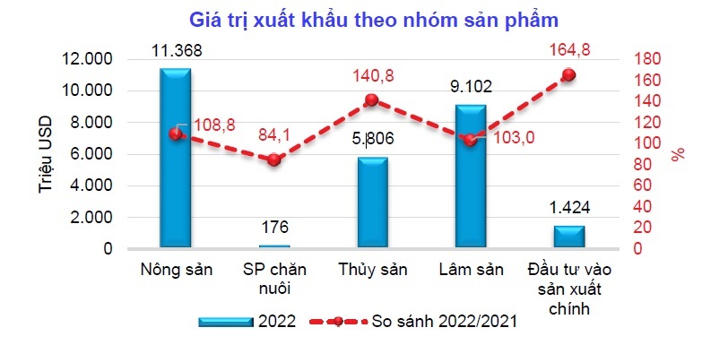 Theo Báo cáo của Bộ Nông nghiệp và Phát triển Nông thôn, kim ngạch xuất khẩu nông lâm thủy sản tháng 6 năm 2022 ước đạt 5,18 tỷ USD, đưa tổng giá trị xuất khẩu 6 tháng đầu năm 2022 đạt 27,88 tỷ USD, tăng 13,9% so với cùng kỳ năm 2021. Trong đó, giá trị xuất khẩu các mặt hàng nông sản chính ước đạt 11,37 tỷ USD, tăng 8,8%; giá trị xuất khẩu thủy sản ước đạt 5,8 tỷ USD, tăng 40,8%; giá trị xuất khẩu các mặt hàng lâm sản ước đạt 9,1 tỷ USD, tăng 3%; giá trị xuất khẩu đầu vào sản xuất ước đạt 1,42 tỷ USD, tăng 64,8%; giá trị xuất khẩu muối ước đạt 2,7 triệu USD, tăng 78,8%.