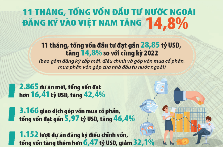 Theo báo cáo của Bộ Kế hoạch và Đầu tư, tính đến ngày 20/11/2023, tổng vốn đăng ký cấp mới, điều chỉnh và góp vốn mua cổ phần, mua phần vốn góp (GVMCP) của nhà đầu tư nước ngoài đạt gần 28,85 tỷ USD, tăng 14,8% so với cùng kỳ, tăng nhẹ 0,1 điểm phần trăm so với 10 tháng năm 2023. Ngoài vốn đầu tư điều chỉnh giảm thì vốn đầu tư mới và GVMCP vẫn tiếp tục tăng hơn so với cùng kỳ.