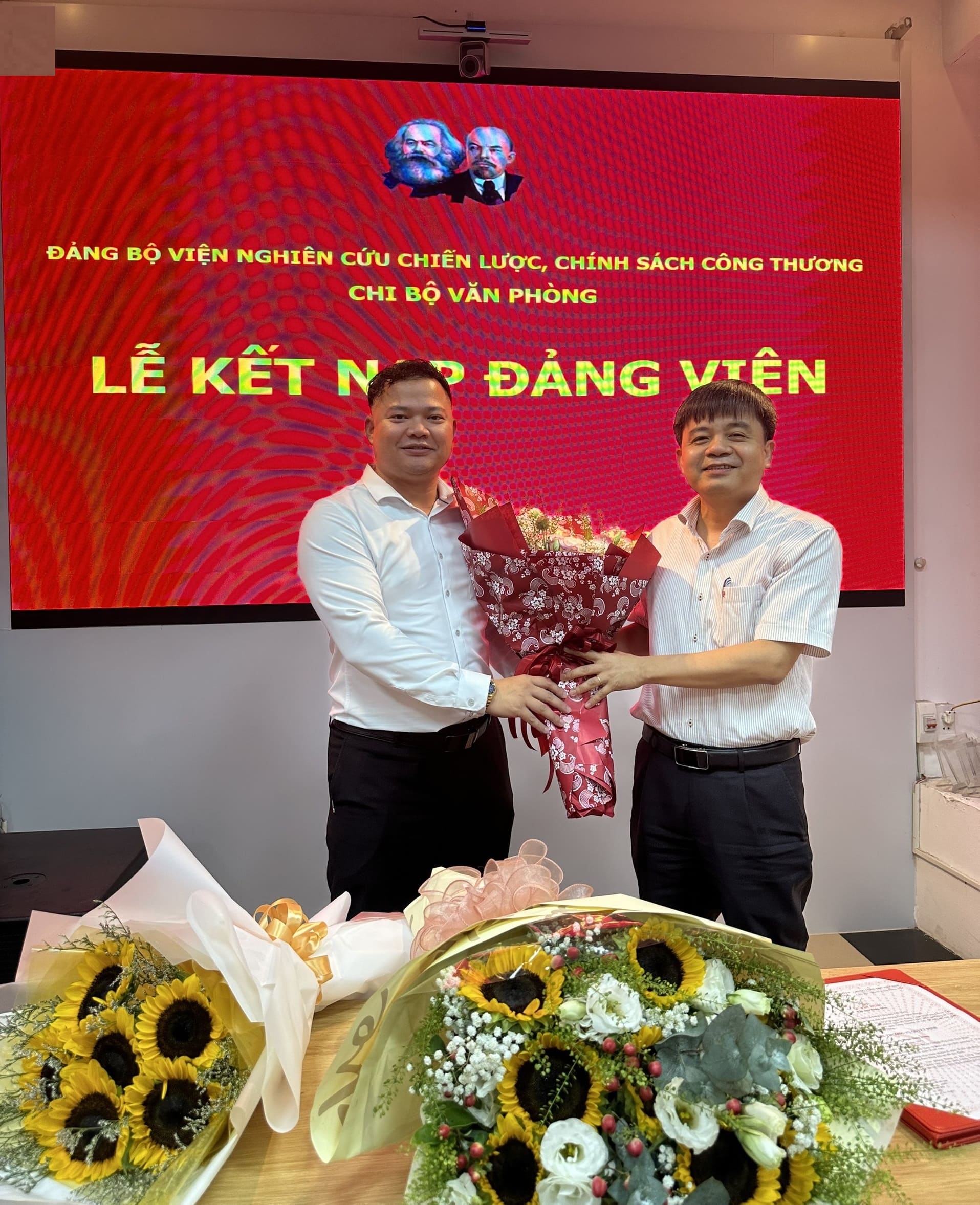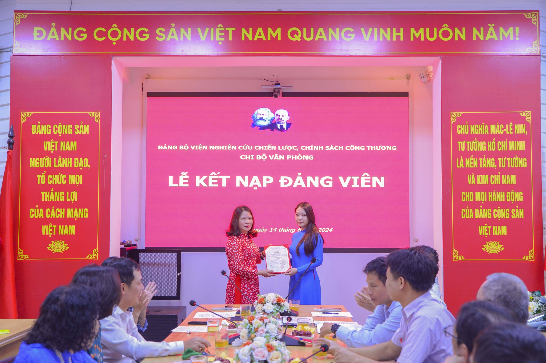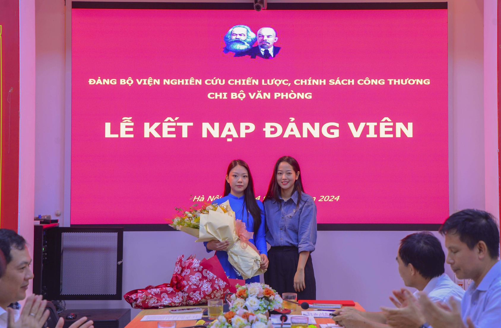 Thực hiện Điều lệ Đảng và các quy định của Trung ương về kết nạp đảng viên mới, sáng ngày 14 tháng 6 năm 2024, được sự đồng ý của Đảng uỷ Viện Nghiên cứu chiến lược, chính sách Công Thương, Chi bộ Văn phòng tổ chức Lễ kết nạp đảng viên mới cho 02 quần chúng ưu tú: Phạm Thùy Dung và Đặng Hoàng Mai - Chuyên viên Văn phòng, Viện Nghiên cứu chiến lược, chính sách Công Thương.