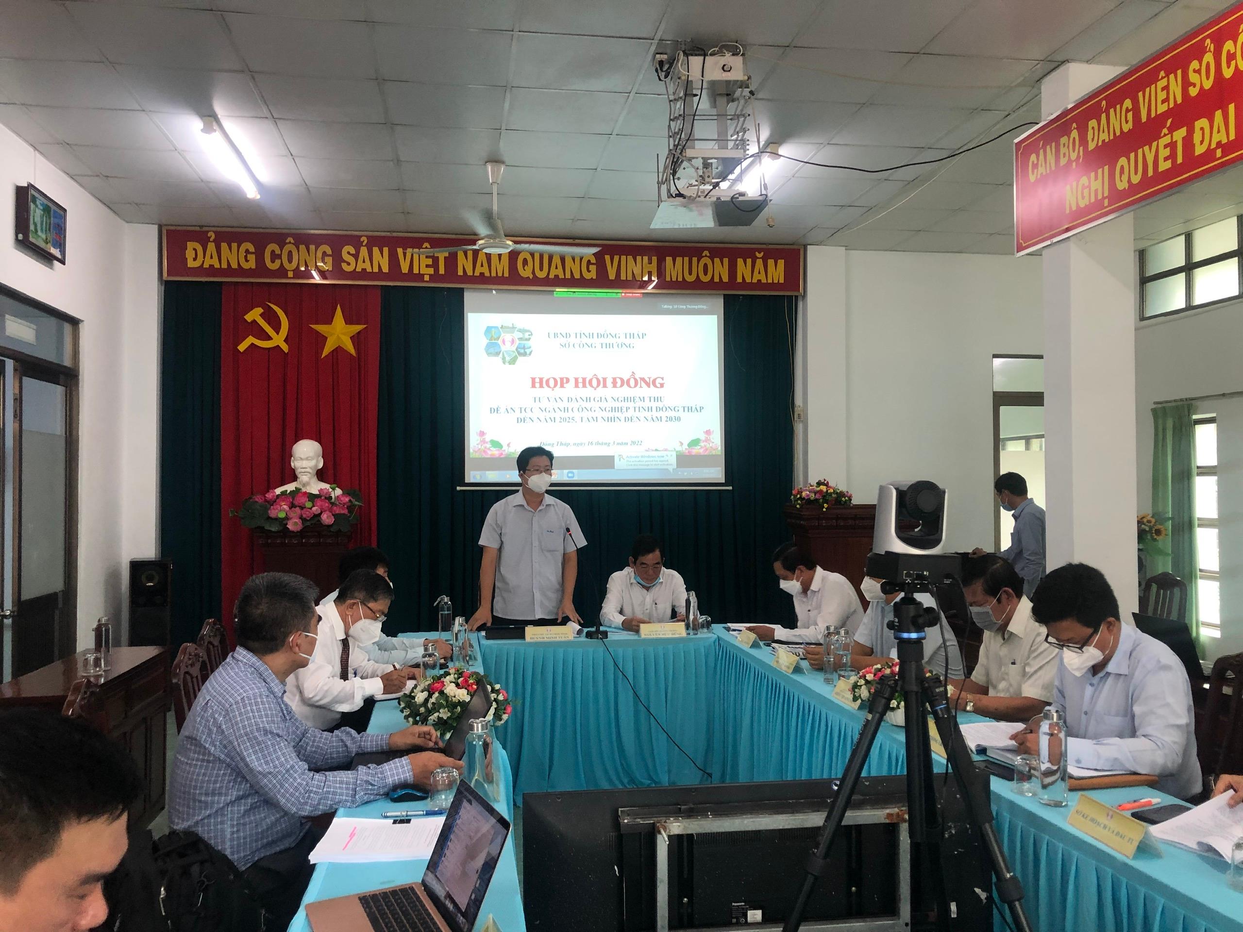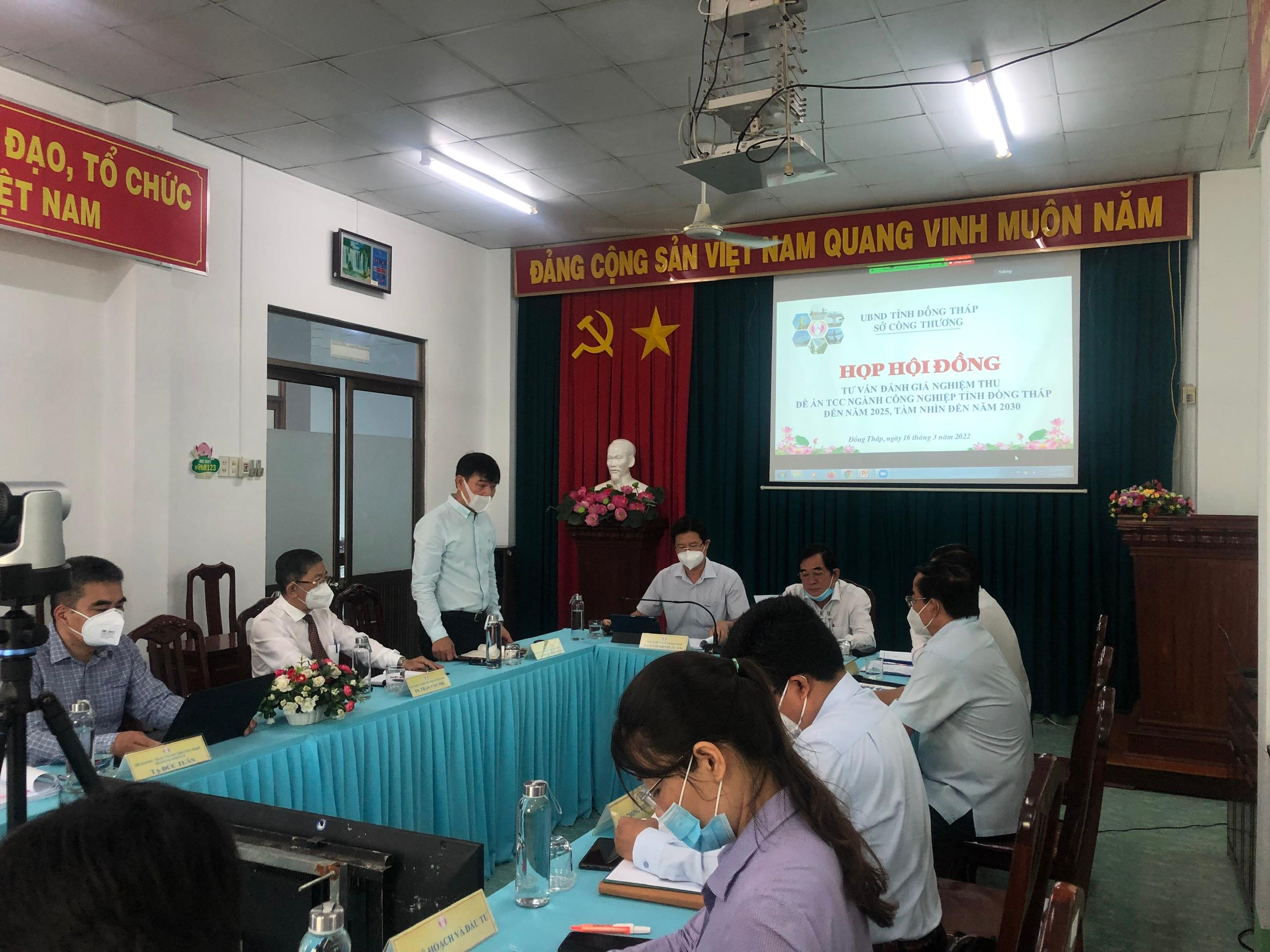 Hội đồng tư vấn, đánh giá nghiệm thu được thành lập theo quyết định số: 60/QĐ-UBND-TL ngày 09/03/2022; Hội đồng do ông Huỳnh Minh Tuấn – Phó Chủ tịch UBND tỉnh Đồng Tháp làm chủ tịch hội đồng; Ông Nhị Văn Khải – nguyên Tỉnh ủy viên, nguyên bí thư Huyện ủy Tháp Mười - Ủy viên phản biện và Ông Khúc Quang Dũng – nguyên Tỉnh ủy viên, nguyên Giám đốc Sở kế hoạch và đầu tư - ủy viên phản biện; Cùng các ủy viên hội đồng là lãnh đạo các Sở, ban ngành của Tỉnh. Về phía cơ quan tư vấn chiến lược có sự tham dự của ông Vũ Quang Hùng – Phó Viện trưởng Viện Nghiên cứu Chiến lược, Chính sách Công Thương – trưởng đoàn; ông Tạ Đức Tuân – Phó Giám đốc Trung tâm phát triển Công nghiệp, Thương mại và Kinh tế số, chủ nhiệm nhiệm vụ và các thành viên nhóm thực hiện đề án.