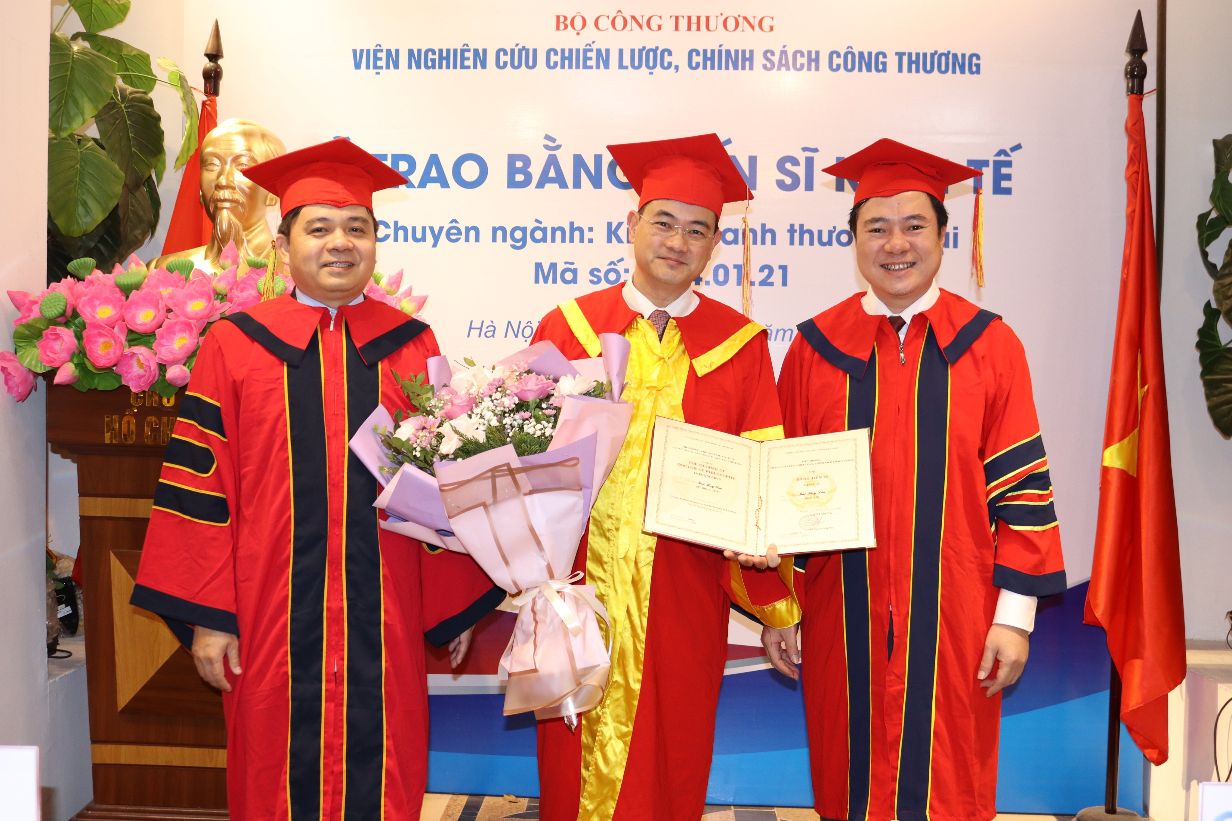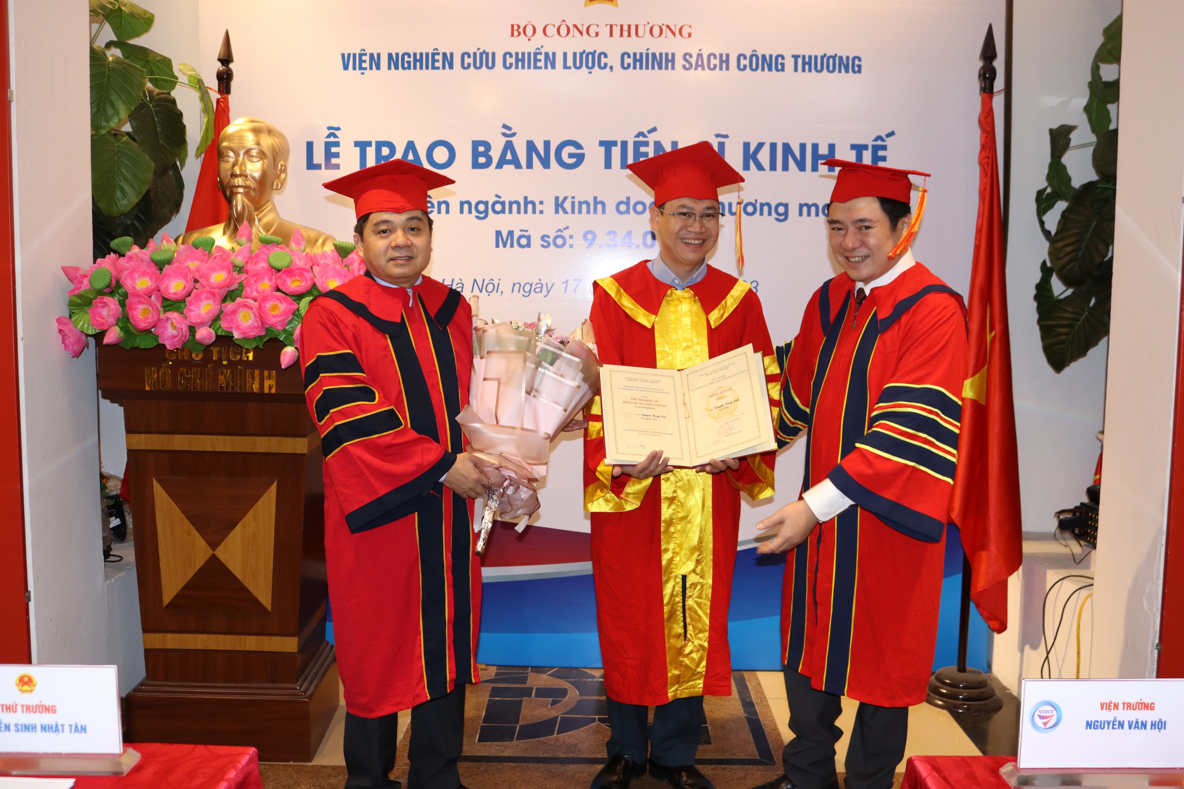 Tại buổi lễ, TS. Nguyễn Sinh Nhật Tân - Thứ trưởng Bộ Công Thương và TS. Nguyễn Văn Hội - Viện trưởng Viện Nghiên cứu Chiến lược, Chính sách Công Thương đã trao bằng và tặng hoa cho 7 tân tiến sĩ: