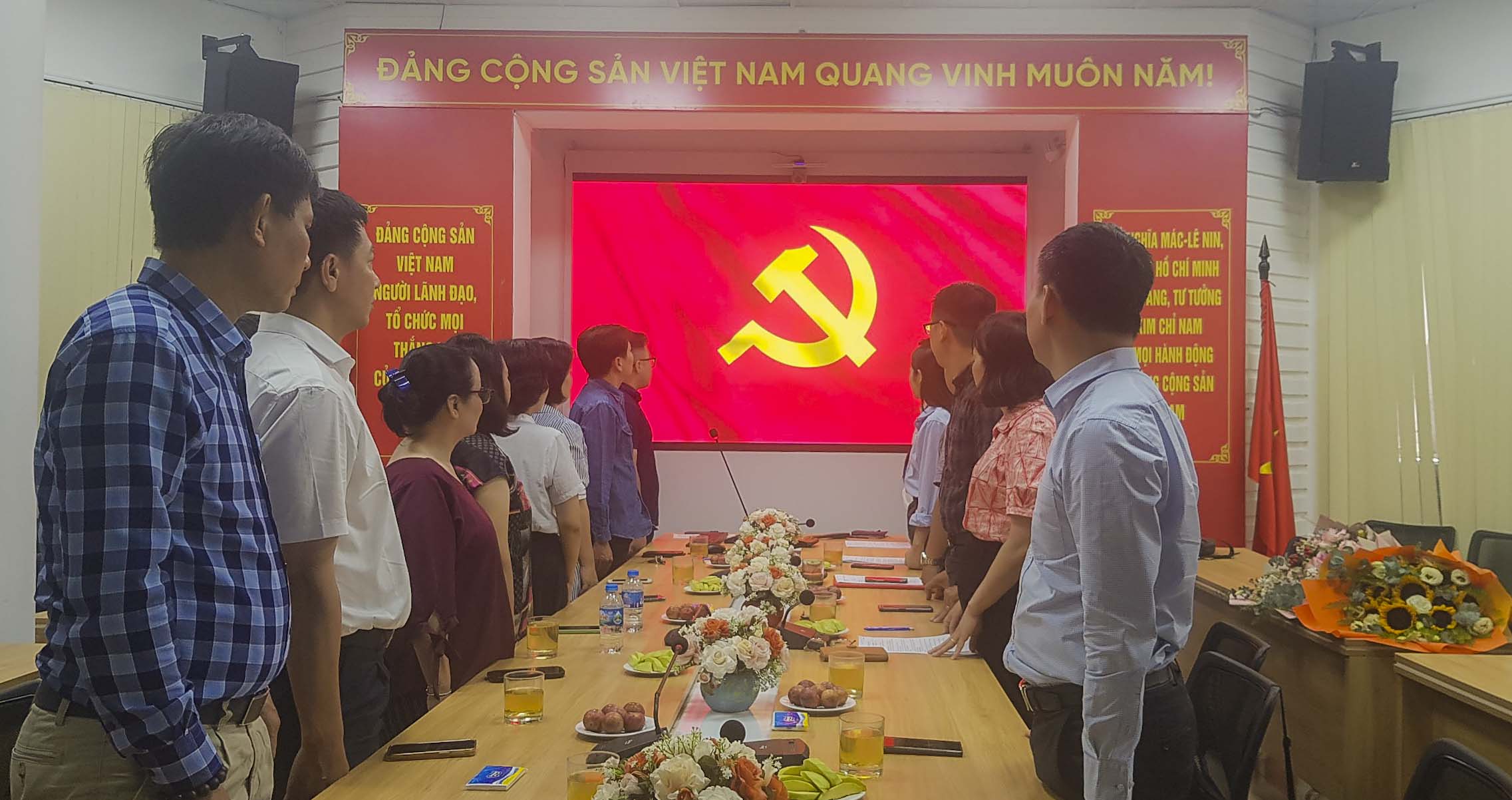 Đồng chí Phạm Ngọc Dũng - Chi bộ Thị trường sau khi nhận quyết định kết nạp, đứng dưới lá cờ Đảng, lá cờ Tổ quốc và chân dung Chủ tịch Hồ Chí Minh cùng sự chứng kiến của Đảng bộ Viện, Chi bộ, đã tuyên thệ lời thề của người đảng viên Đảng Cộng sản Việt Nam, hứa sẽ tiếp tục phấn đấu để luôn xứng đáng là người đảng viên gương mẫu, hoàn thành tốt mọi nhiệm vụ dược giao, góp phần xây dựng Chi bộ ngày càng vững mạnh.