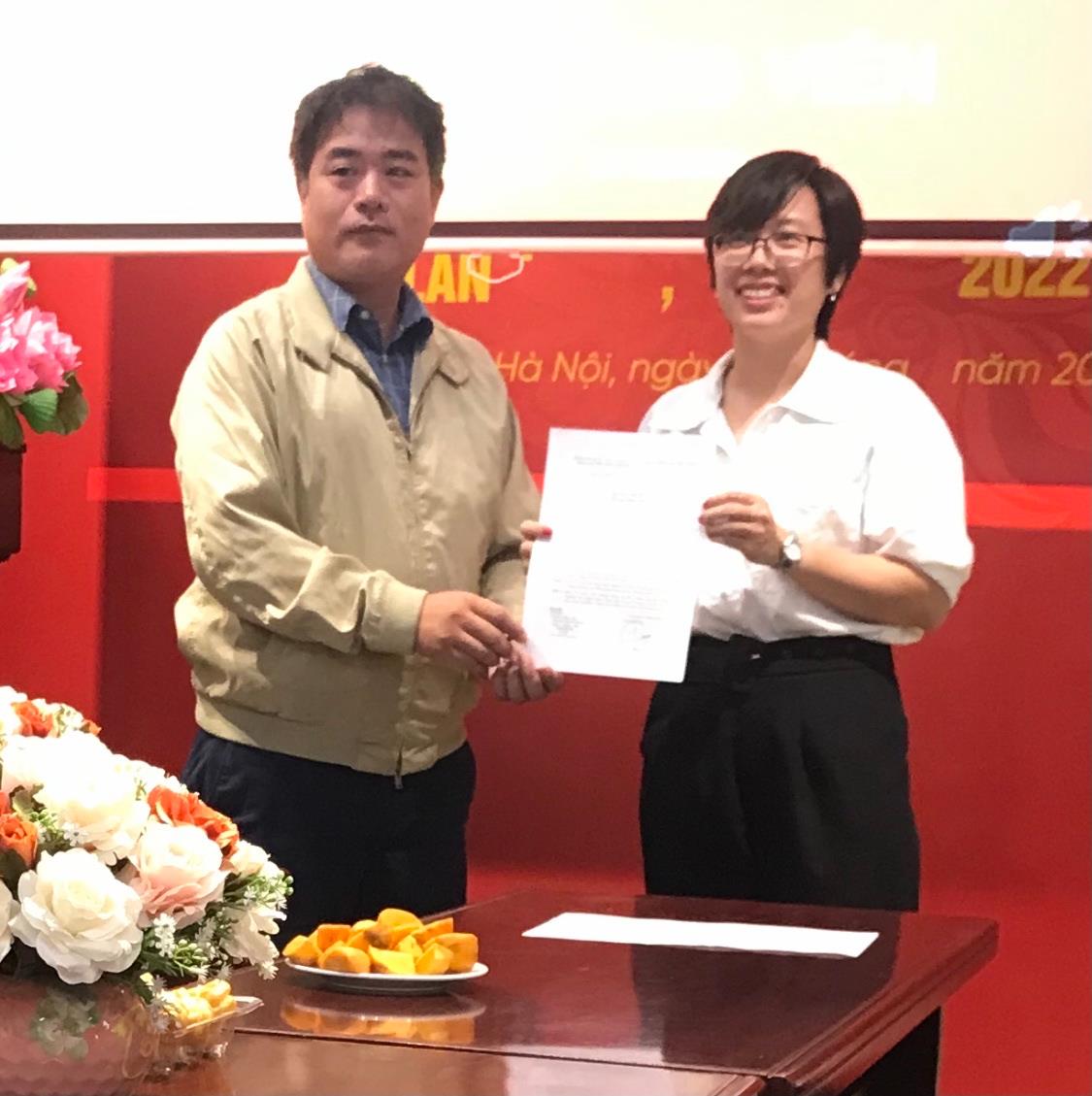 Bí thư Chi bộ Tạp chí Đỗ Quang trao Quyết định kết nạp Đảng cho đồng chí Ngô Thị Thanh Hương