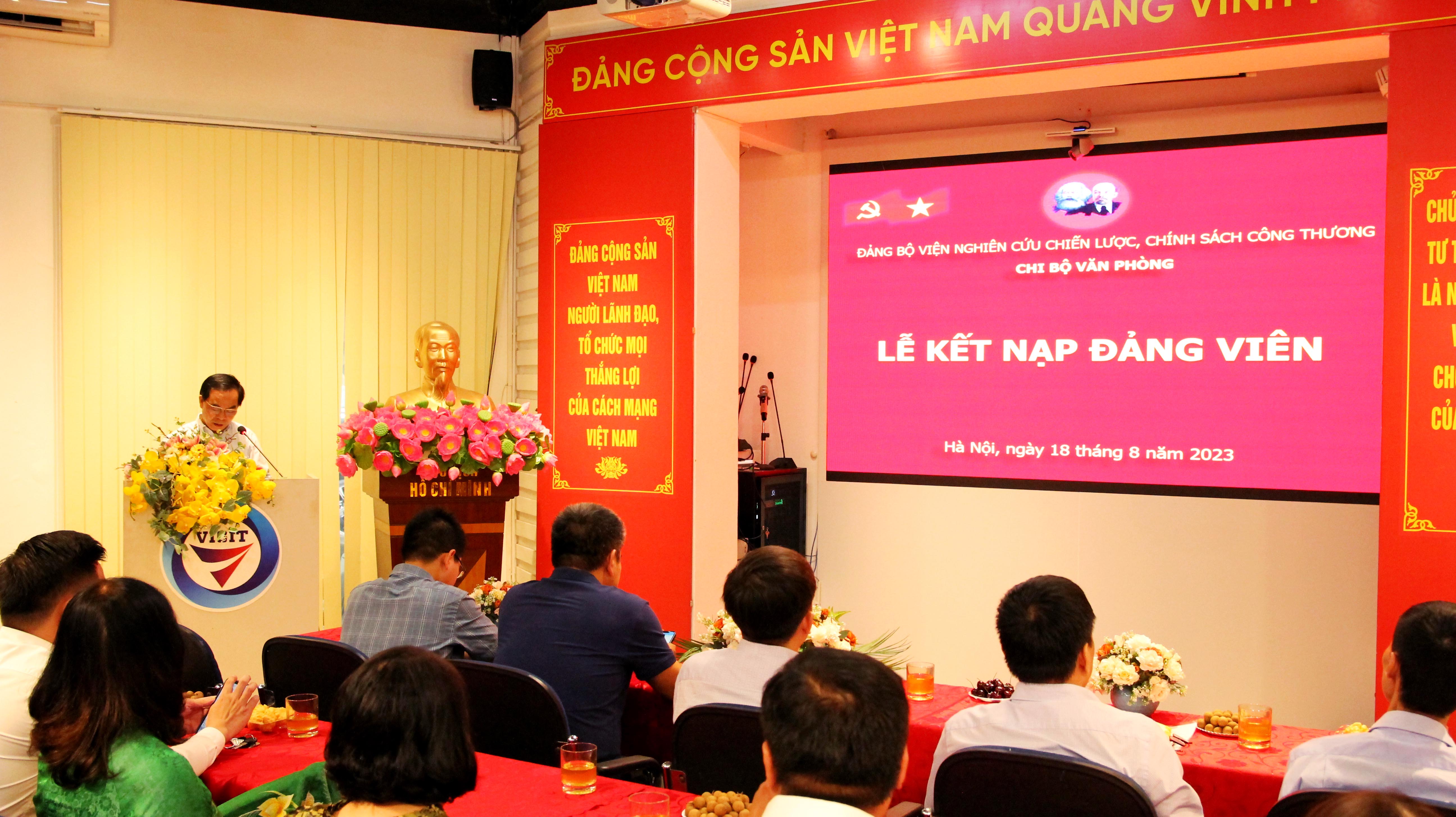 Được sự đồng ý của Đảng uỷ Viện Nghiên cứu Chiến lược, Chính sách Công Thương, sáng ngày 18/8/2023, tại Trụ sở Viện Nghiên cứu Chiến lược, Chính sách Công Thương số 17 Yết Kiêu - P.Nguyễn Du – Hoàn Kiếm - Hà Nội, Chi bộ Văn phòng thuộc Đảng bộ Viện đã trang trọng tổ chức Lễ kết nạp đảng viên mới.