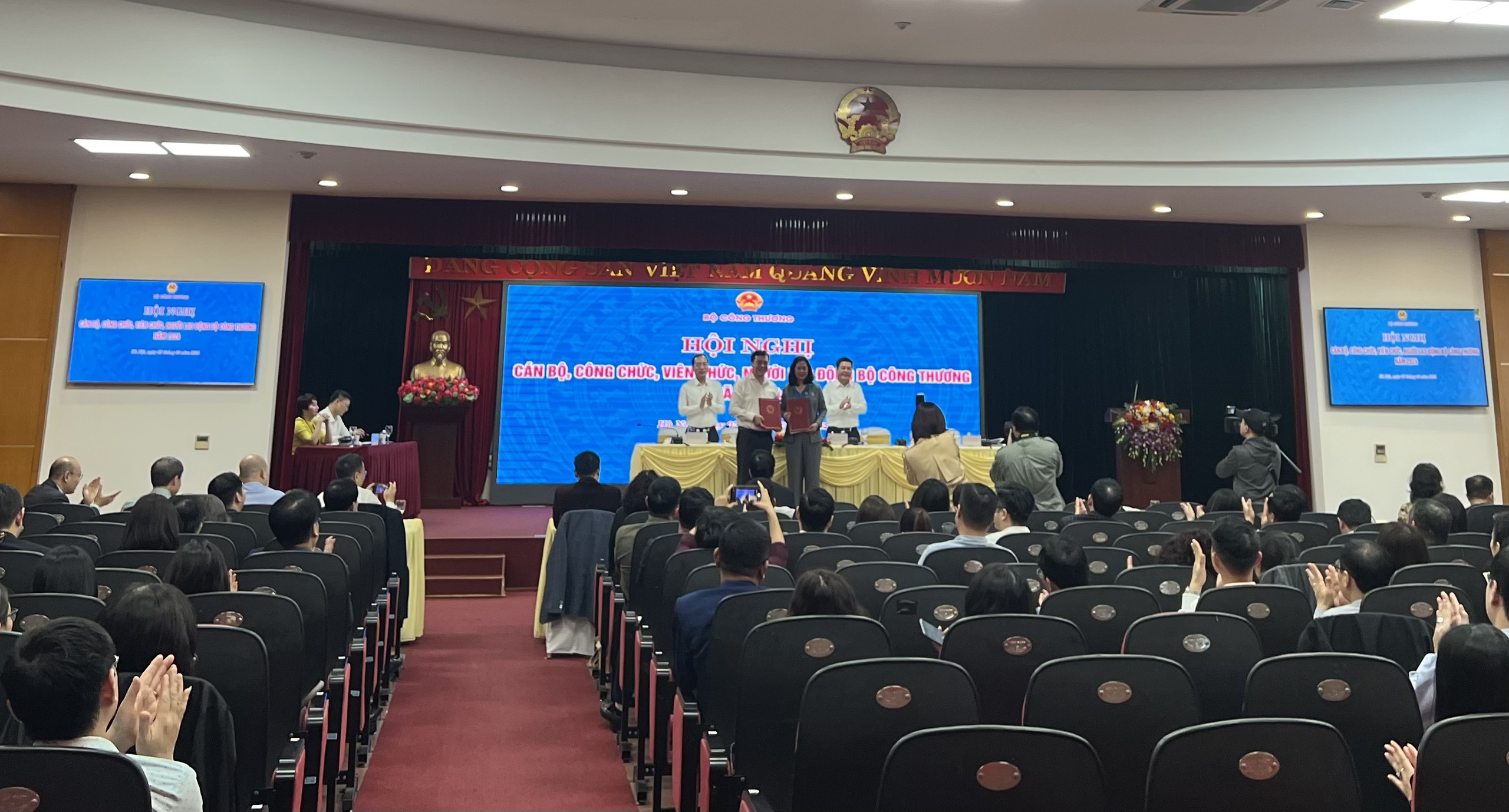 Thực hiện các quy định tại Luật số 10/2022/QH15 ngày 10/11/2022 của Quốc hội về thực hiện dân chủ ở cơ sở, có hiệu lực từ ngày 1/7/2023 và Nghị định số 04/2015/NĐ-CP ngày 9/1/2015 của Chính phủ về thực hiện dân chủ trong hoạt động của cơ quan hành chính nhà nước và đơn vị sự nghiệp công lập, Thông tư số 01/2016/TT-BNV ngày 13/1/2016 của Bộ Nội vụ hướng dẫn Nghị định 04, chiều ngày 05/02/2024 Bộ Công Thương đã tổ chức Hội nghị cán bộ, công chức, viên chức và người lao động Bộ Công Thương năm 2024 tại Hội trường tầng 7, nhà B, trụ sở Bộ Công Thương, 54 Hai Bà Trưng, Hà Nội.