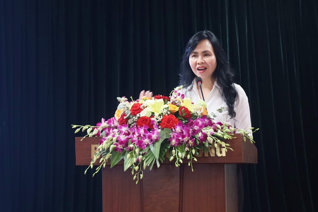 Hình 2: Đồng chí Lê Hoàng Oanh, Ủy viên Ban Thường vụ, Trưởng ban Tuyên giáo Đảng ủy Bộ, Cục trưởng Cục Thương mại điện tử và Kinh tế số trình bày tại Diễn đàn