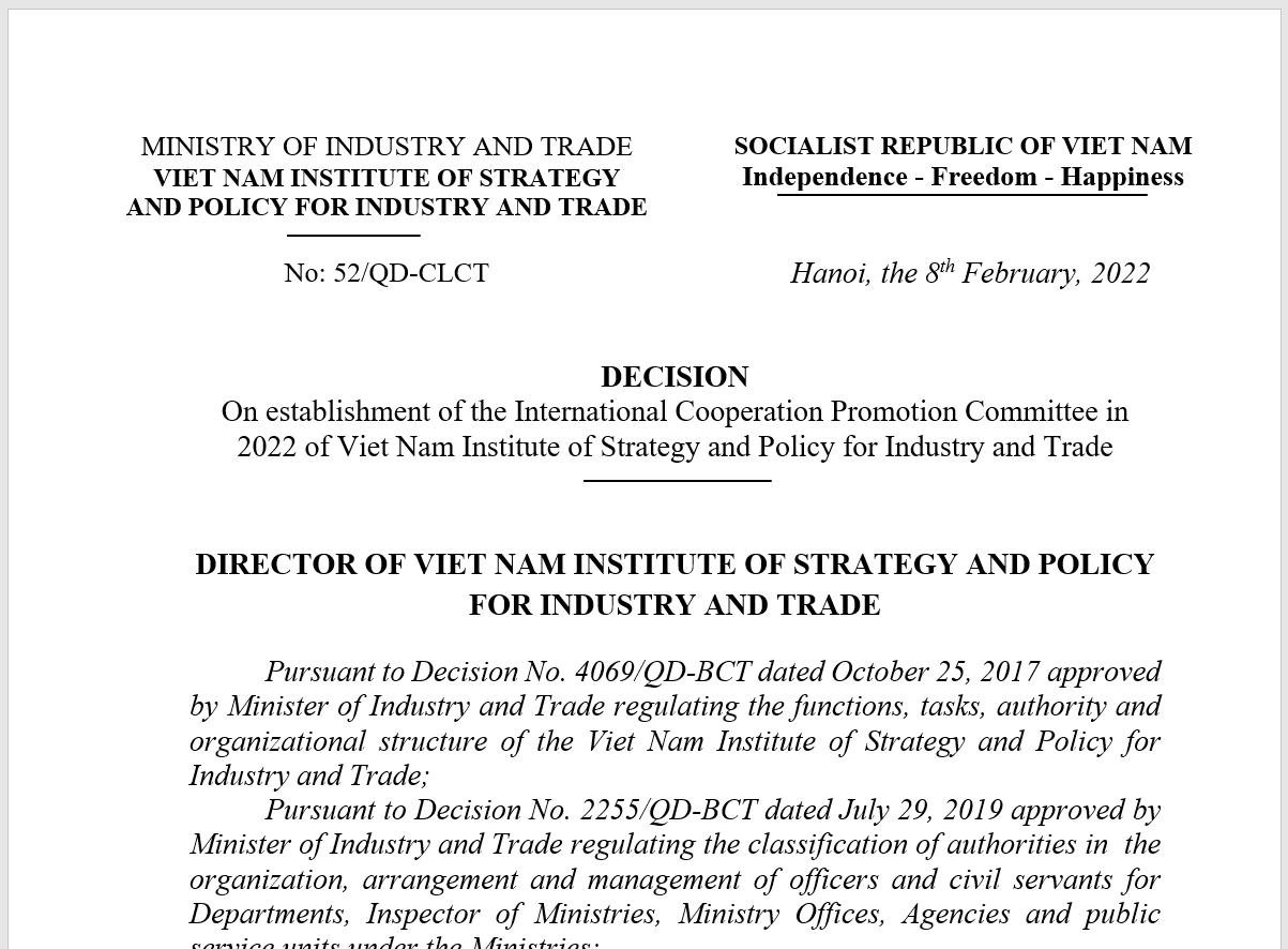On 21 February 2022, General Director of VIOIT, Dr. Nguyen Van Hoi, signed Decision No. 52/QD-CLCT establishing the VIOIT’s International Cooperation Team (ICT - whose official name is “International Cooperation Promotion Board”). The establishment of ICT is based on Dr. Hoi’svision that VIOIT needs to “internationalize” to provide the Government and the Party with useful research findings and sound recommendations for Viet Nam’s policymaking with a better understanding of the industry and trade-related strategic issues in the context of rapidly globalizing Viet Nam’s economy.