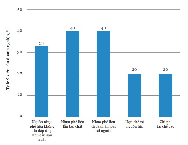 • Nguồn nhựa phế liệu trong nước có nhiều tạp chất làm gia tăng chi phí, ảnh hưởng đến chất lượng sản phẩm nhựa tái chế, giảm sức cạnh tranh của các sản phẩm tái chế. Nguồn cung phế liệu không ổn định dẫn đến khó khăn trong việc lên kế hoạch cũng như mở rộng quy mô sản xuất. Sự bị động về nguồn cung cũng là nguyên nhân khiến ngành tái chế nhựa khó triển khai các dự án tái chế quy mô lớn.