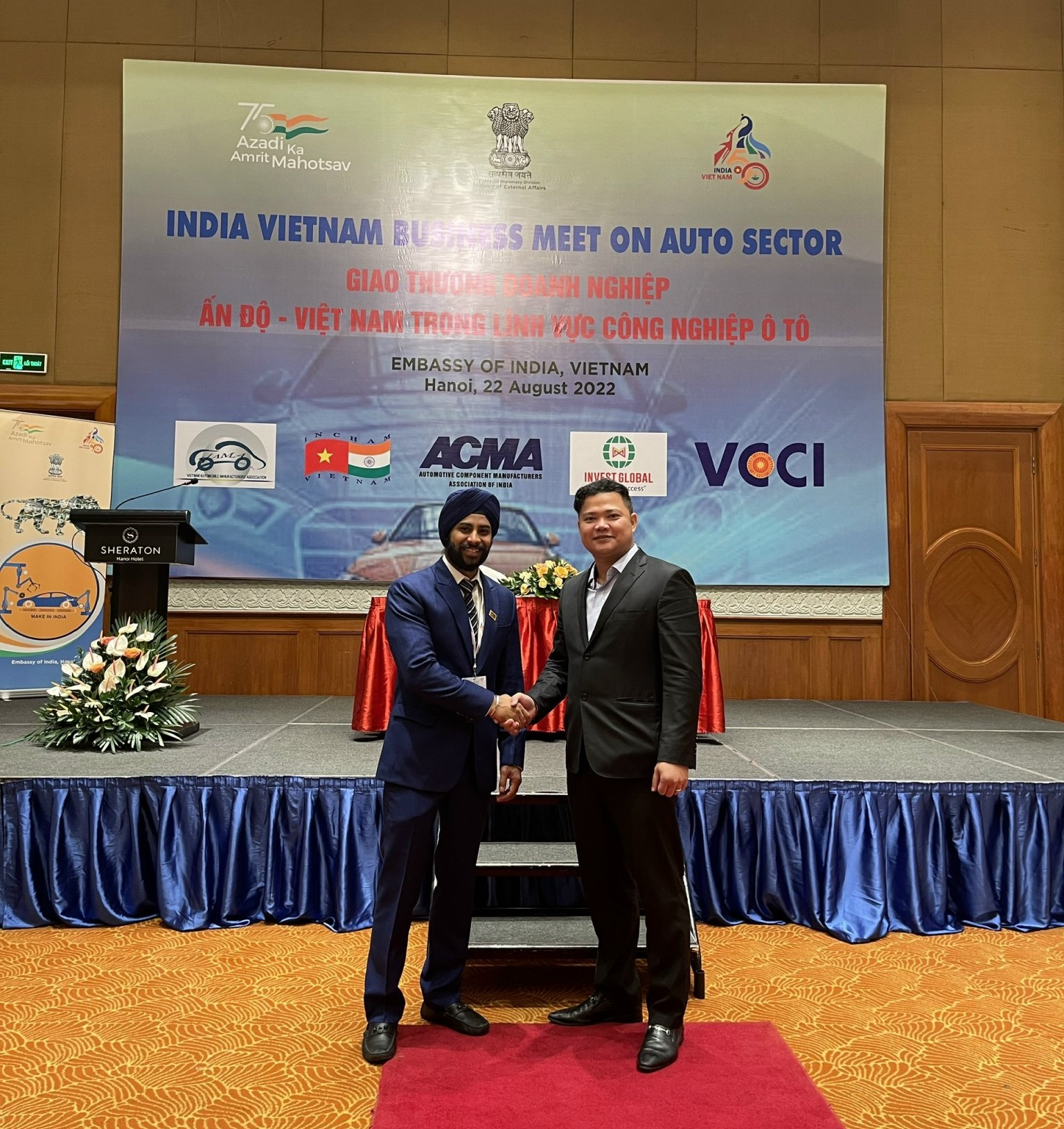 Nhằm tăng cường hợp tác song phương trong lĩnh vực công nghiệp Ô tô, Đại sứ quán Ấn Độ phối hợp với Trung tâm thông tin và tư vấn đầu tư Invest Global (Hiệp hội Doanh nghiệp Đầu tư Nước ngoài VAFIE) tổ chức sự kiện “Gặp gỡ Doanh nghiệp Ấn Độ - Việt Nam trong lĩnh vực công nghiệp Ôtô” vào ngày 22/08/2022 tại khách sạn Sheraton Hà Nội. Đây là sự kiện trong chuỗi sự kiện của Hiệp hội các Nhà sản xuất Phụ tùng Ô tô Ấn Độ (ACMA) trong chuyến thăm và làm việc tại Việt Nam với các doanh nghiệp lắp ráp ôtô lớn của Việt Nam và các doanh nghiệp trong chuỗi cung ứng sản xuất phụ tùng ôtô tại Việt Nam từ ngày 21/8/2022 đến 26/8/2022.