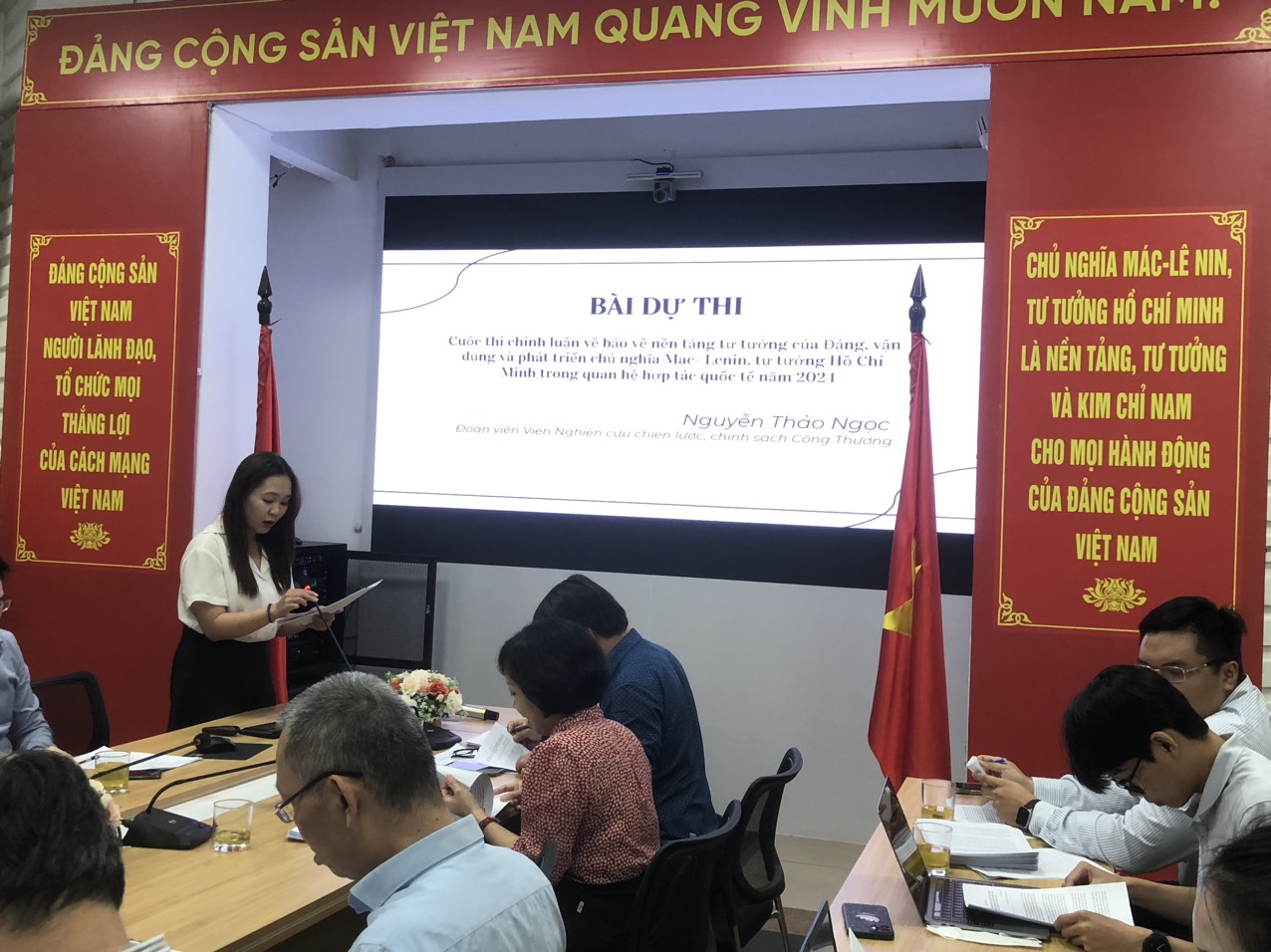Hội thảo đã được nghe các chuyên viên, nghiên cứu viên trẻ trình bày các tham luận như: Phát huy vai trò báo chí trong bảo vệ nền tảng tư tưởng của Đảng hiện nay; Đấu tranh phản bác các quan điểm sai trái, thù địch trong bảo vệ an ninh năng lượng quốc gia; Bảo vệ nền tảng tư tưởng của Đảng, vận dụng và phát triển chủ nghĩa Mác - Lênin, tư tưởng Hồ Chí Minh trong quan hệ hợp tác quốc tế năm 2024; Ý nghĩa của tư tưởng Hồ Chí Minh đối với việc xây dựng, phát triển ngành Công Thương; Đấu tranh với những thông tin sai trái, thù địch trên không gian mạng trong bối cảnh chuyển đổi số nhằm tăng cường bảo vệ nền tảng tư tưởng của Đảng; Cán bộ công chức, viên chức Viện Nghiên cứu chiến lược, chính sách Công Thương đấu tranh với các hành vi xuyên tạc tư tưởng của Đảng, chống phá nhà nước trên các nền tảng mạng xã hội; Bảo vệ nền tảng tư tưởng của Đảng, đấu tranh, phản bác các quan điểm sai trái, thù địch; Tăng cường bảo vệ, phổ biến các quan điểm của Đảng về an toàn thực phẩm trong tình hình mới; Bảo vệ, lan tỏa đường lối, chủ trương, chính sách của Đảng, pháp luật của Nhà nước. Nhận diện và đấu tranh, phản bác các quan điểm sai trái, thù địch chống phá Đảng và Nhà nước trong ngành Công Thương; Bảo vệ nền tảng tư tưởng của Đảng trong tình hình mới.