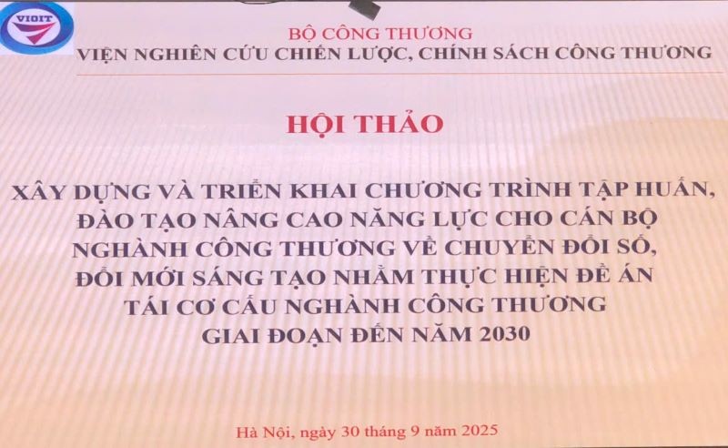 Sáng ngày 30 tháng 9 năm 2025, tại Hội trường tầng 1 - Viện Nghiên cứu Chiến lược, Chính sách Công Thương, số 17 Yết Kiêu, Hà Nội đã diễn ra Hội thảo lấy ý kiến chuyên gia cho tài liệu, khung chương trình thuộc nhiệm vụ “Xây dựng và triển khai chương trình tập huấn, đào tạo nâng cao năng lực cho cán bộ ngành Công Thương về chuyển đổi số, đổi mới sáng tạo nhằm thực hiện Đề án tái cơ cấu ngành Công Thương giai đoạn đến năm 2030” do ThS. Nguyễn Thanh Phượng - Trung tâm Đào tạo, bồi dưỡng Công Thương - Viện Nghiên cứu Chiến lược, Chính sách Công Thương làm chủ nhiệm.