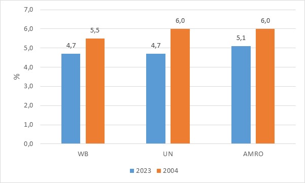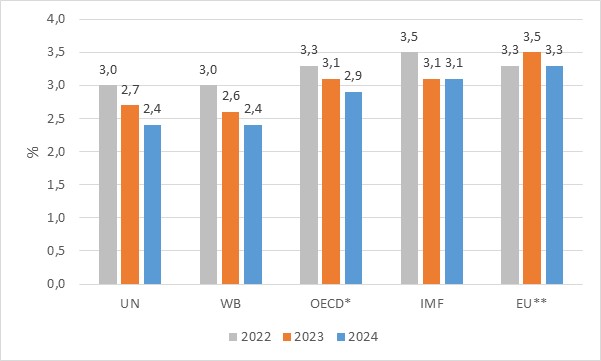 Các tổ chức quốc tế (UN, WB, OECD và EU) đều cho rằng tăng trưởng kinh tế toàn cầu năm 2024 sẽ thấp hơn năm 2023, riêng IMF dự báo bằng với năm 2023.