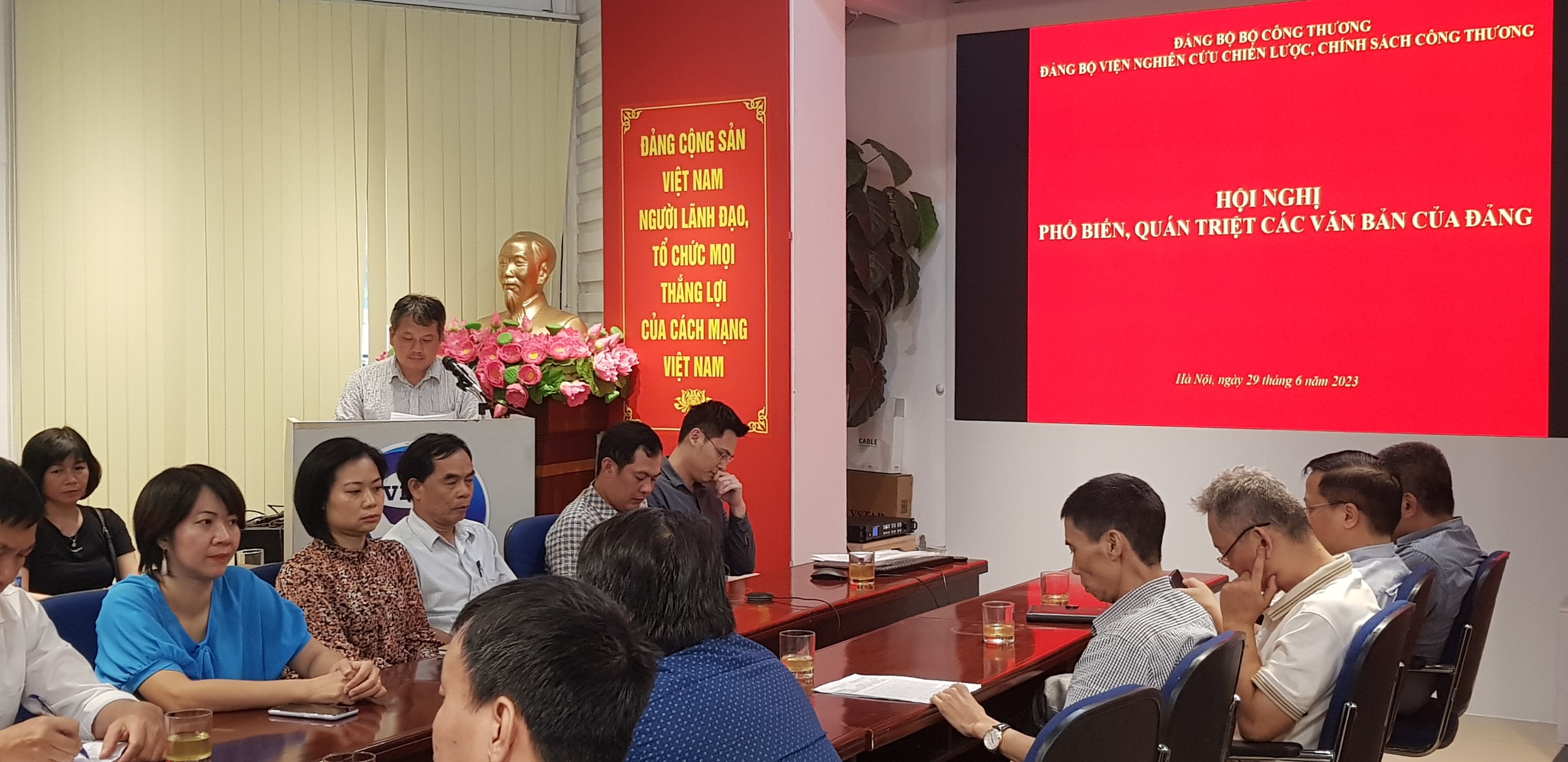 Sáng ngày 29 tháng 6 năm 2023, tại trụ sở Viện Nghiên cứu Chiến lược, Chính sách Công Thương, Đảng bộ Viện Nghiên cứu Chiến lược, Chính sách Công Thương đã tổ chức Hội nghị quán triệt và phổ biến các văn bản của Đảng cho toàn thể Đảng viên thuộc Đảng bộ Viện Nghiên cứu Chiến lược, Chính sách Công Thương.